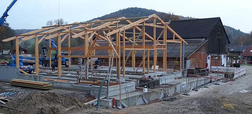 Auch der Bau des neuen Boxenlaufstalls für das Milchvieh hat zwischenzeitlich begonnen. Wie auf dem Bild zu sehen wird der Oberbau komplett aus Holz errichtet. Sobald der neue Stall fertig gestellt ist, können die Kühe den alten Stall vorübergehend verlassen, so dass dort die Bodenplatte und der Melkstand ungehindert errichtet werden kann.
