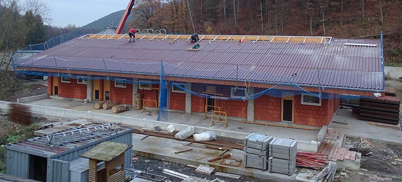 Das Dach vor dem Laden nimmt Formen an. Die Firma Petry aus Bad Dürkheim legt die Folie auf und dichtet die Randbereiche ab. Deutlich erkennbar sind die Einfassungen für die Lichtkuppeln, die für Helligkeit im Hofladen sorgen werden. Sobald die Dachfolie fertig ausgelegt ist, werden die Zimmermänner unserer Lebenshilfe das Glas einsetzen.
