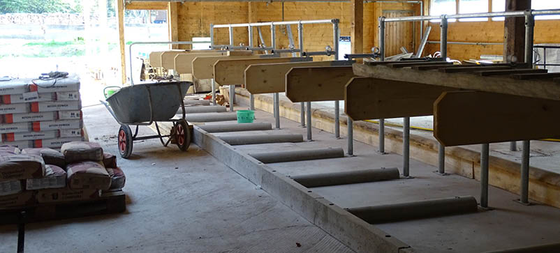 Auch im neu- und umgebauten Boxenlaufstall hat sich einiges bewegt: Zum einen wurden die Liegeboxen für die Kühe angelegt, zum anderen wird mit Hochdruck am Melkstand gearbeitet.