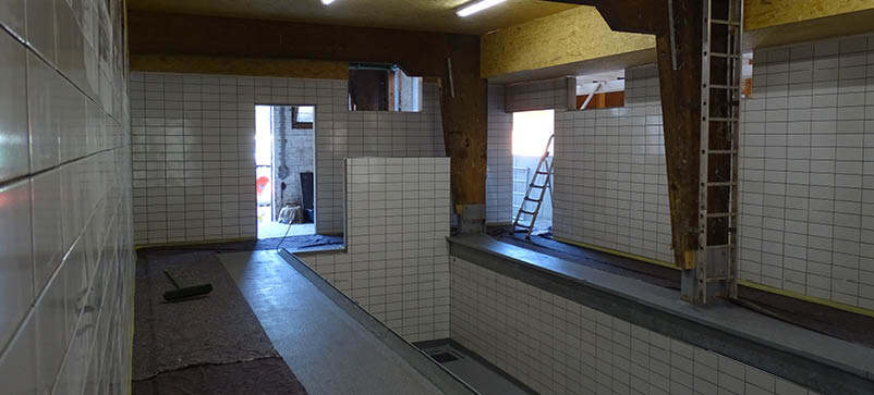 Immer mehr kann man sich nun vorstellen, was bald in unserem Neubau geschehen wird. In der künftigen Molkerei wurden die Fliesen fachmännisch verlegt und wie man auf dem Bild gut erkennen kann, auch schon verfugt.