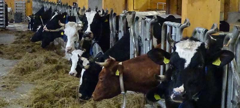 Für unsere Mitarbeiter mit Behinderung, die im Stall arbeiten, ist insbesondere die Stahltreppe, die zur Empore im Stall führt eine tolle, unbezahlbare Arbeitserleichterung. So können Sie ohne sich einem Verletzungsrisiko auszusetzen, Stroh von oben einstreuen. Bei einer biodynamischen Wirtschaftsweise tragen die Kühe Hörner aus Respekt vor dem Tier, sie dürfen nach den Richtlinien des Demeterverbandes also nicht enthornt werden. Dies wirkt sich im Übrigen auch auf die Qualität der Milch aus. Die Kuh selbst nutzt das Horn zur Kommunikation.