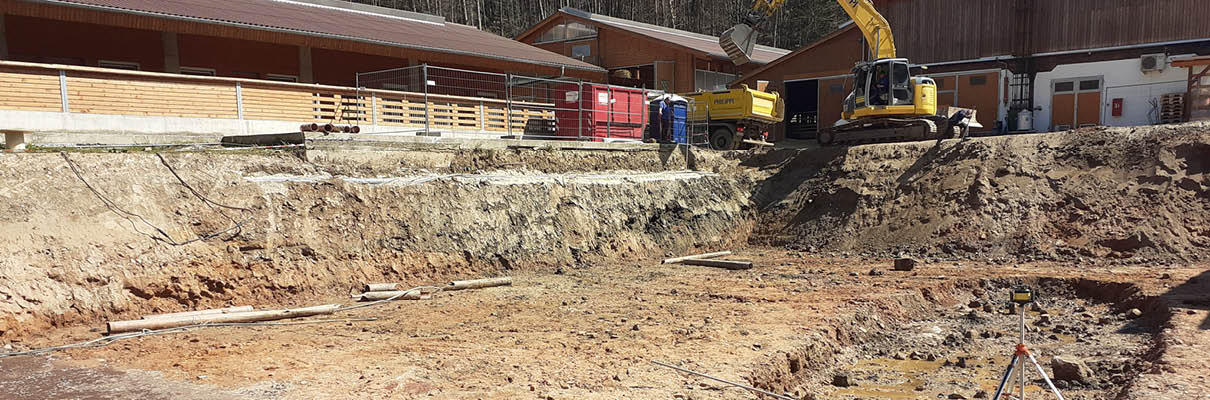 Durch den neuen Boxenlaufstall mit den befestigten Auslaufflächen entsteht deutlich mehr, mit Regenwasser angereicherte Gülle. Deshalb muss das Fassungsvermögen der bisherigen Grube in Höhe von 290 m³ mit dem Bau eines neuen Behälters um 1000 m³ auf insgesamt 1300 m³ erweitert werden. Damit erhöhen wir die Lagerkapazität auf 9 Monate und sind somit in der Lage, diese wertvolle Gülle dann auszubringen, wann die Pflanzen die darin enthaltenen Nährstoffe optimal verwerten können.