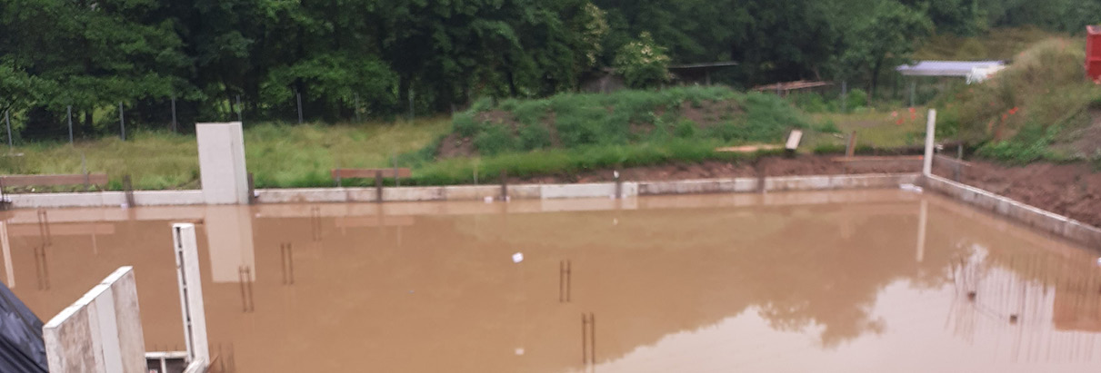 Der Kohlbach kommt von Höningen und mündet am Kleinsägmühlerhof in den Eckbach. Die Wassermassen der vergangenen Nacht konnte der Kohlbach nicht aufnehmen. Sie flossen teilweise in unsere Baugrube. Glücklicherweise war die Bodenplatte betoniert. Sobald das Wasser abgepumpt ist, werden die Abwasserrohre gespült und die Bauarbeiten können fortgesetzt werden. Wir sind mit einem blauen Auge davongekommen!