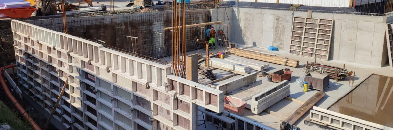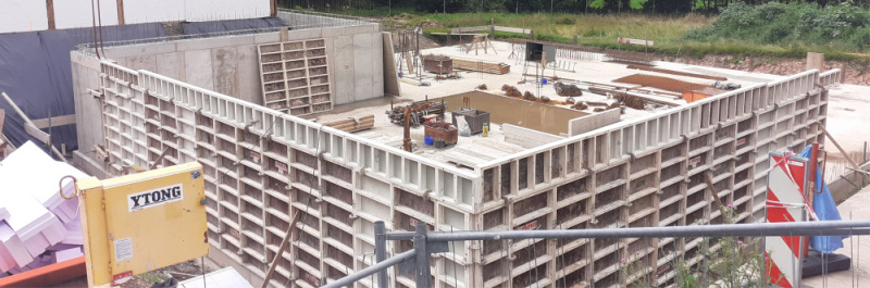 Derzeit werden die Kellerwände in Abschnitten geschalt und betoniert. Im Anschluss daran soll die Außendämmung angebracht werden. Unser Gebäude nimmt weiter Formen an.