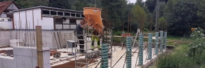 In den Regenpausen wurden letzte Woche die Stützen betoniert. Diese Stützen nehmen zukünftig die Last der Zwischendecke und des Daches auf.