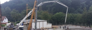 Heute wird die Betondecke gegossen. Ca. 110 qm Beton sind mittels Betonpumpe fortlaufend einzubringen, so dass die Decke in einem Guss fertig gestellt wird. Zuvor haben die Elektriker der Fa. Geib aus Grünstadt die Stromleitungen verlegt und die Männer der Fa. Leininger Bau rund 12 to Stahl verbaut.