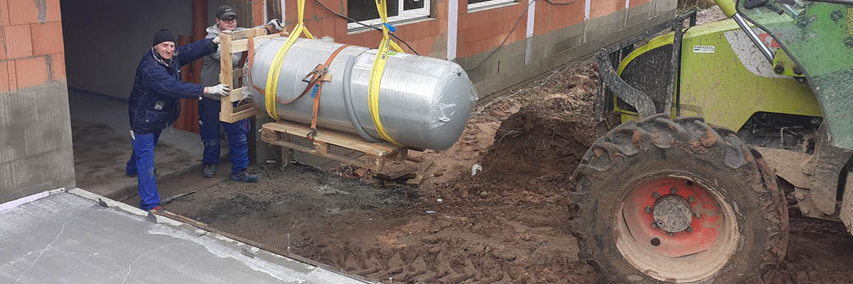 Für unsere Produktionsbereiche brauchen wir einen großen Pufferspeicher für Heizungswasser. Diesen kann man auf dem nachfolgenden Foto erkennen, es ist der metallfarben Speicherbehälter. Dieser hat ca. 10.000 l Kapazität hat, um Spitzenbedarfe an Heizungswasser, das mit unserer Holzhackschnitzelfeuerung erwärmt wird, abzupuffern. Zur Hangbefestigung werden hier L-Winkel gesetzt. Der links mit Kunststofffolie abgedeckte Behälter ist der Holzhackschnitzelbehälter. Dieser fasst 25 m³.
