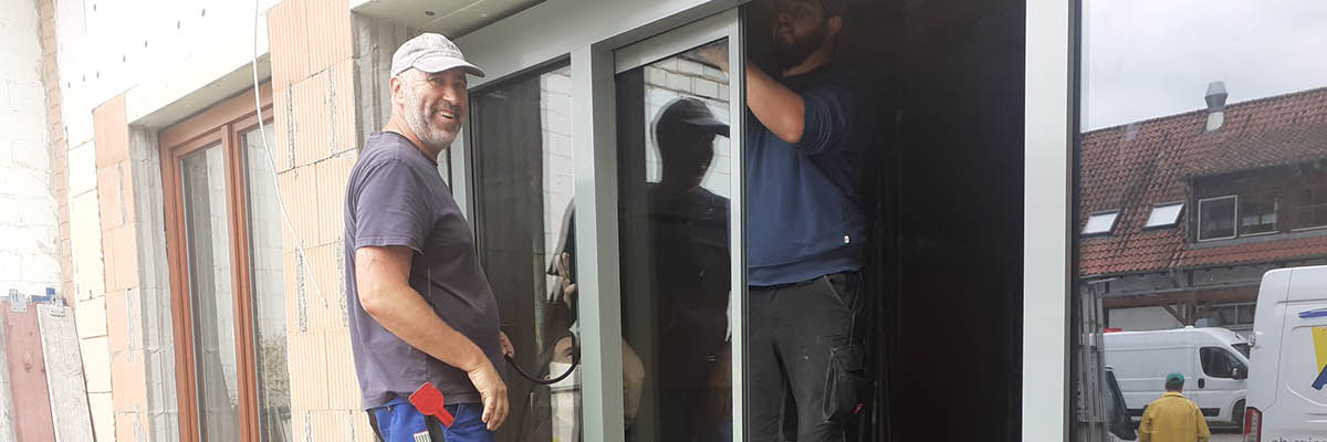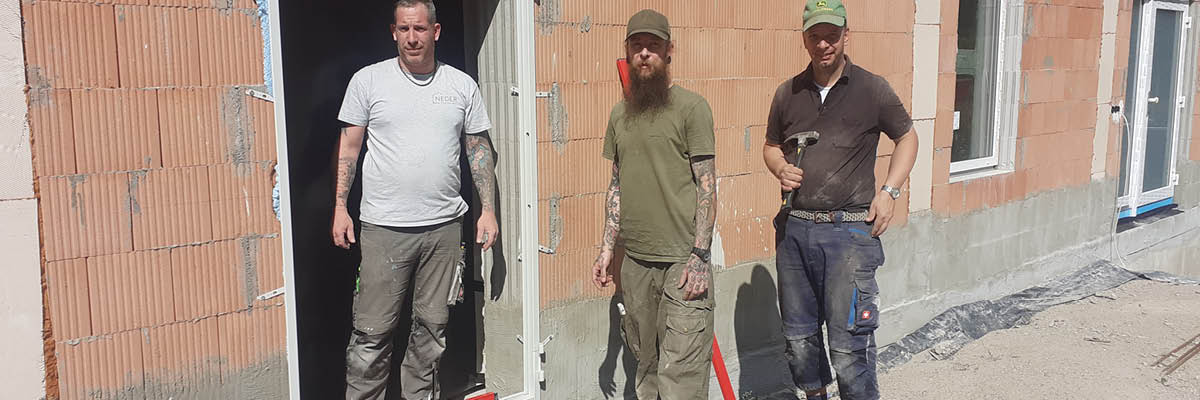 Es geht weiter voran: Die Installation der Haustechnik ist weitgehend abgeschlossen und das lange Warten auf die Türen hat ein gutes Ende gefunden. Von links: Ronny Neder, sein Mitarbeiter Meik Heublein mit Unterstützung von Otfried Held vom Kleinsägmühlerhof haben am Samstag den 06.08.22 damit begonnen, die Zargen einzubauen.