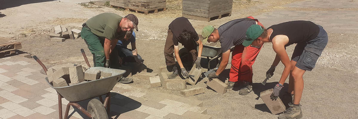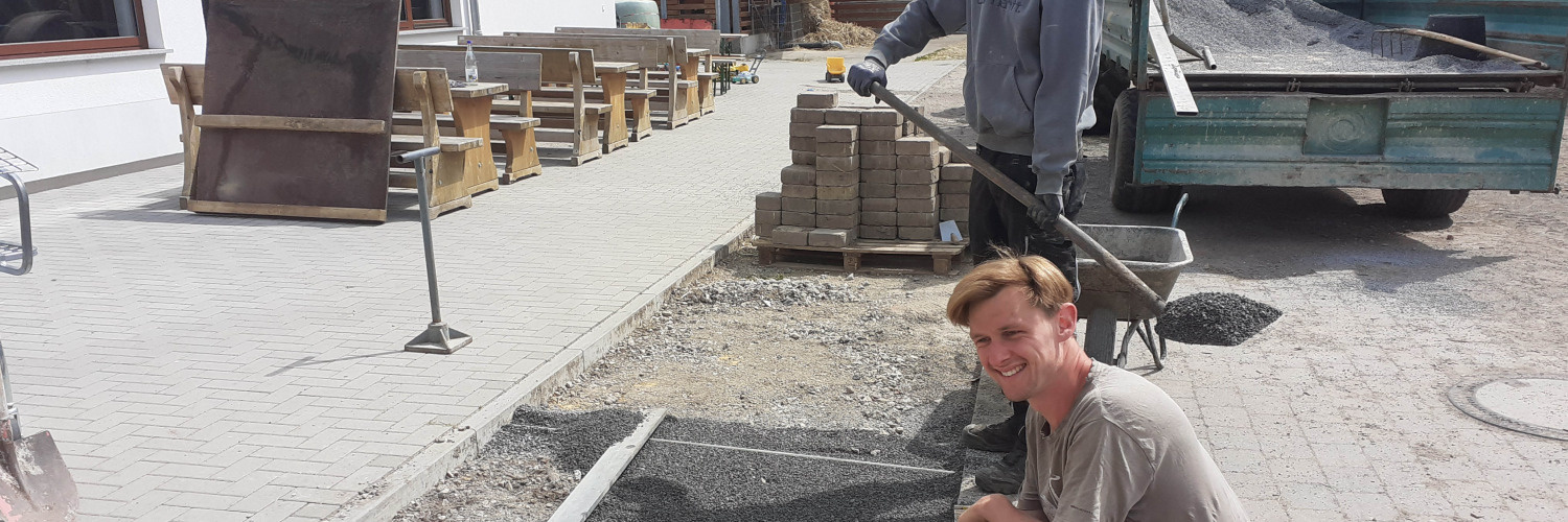 Unser durch die Bauarbeiten ohnehin in Mitleidenschaft geratenes Pflaster muss in Teilen ausgebaut werden. Hier seht ihr unser Hofteam beim Rückbau des Pflasters, so dass nun bald der Graben für die Versorgungsleitungen von unserem Neubau zum Bestand (Heizung, Strom, EDV, Regenwasser) ausgebaggert werden kann.