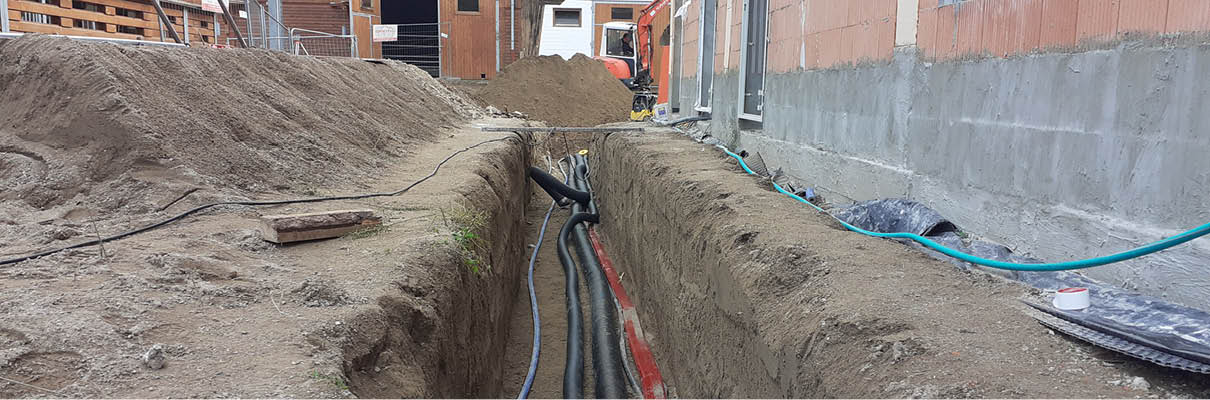 Der Graben führt von dem Stallgebäude zum Bestand. Damit ist die Verbindung zwischen den 3 Gebäudekomplexen (Bestand, Stall und Neubau) hergestellt. Deutlich zu erkennen sind die Leerrohre. Sollten irgendwann mal neue Leitungen erforderlich sein, dann können diese neu verlegt werden, ohne dass der Hof aufgebaggert werden muss.