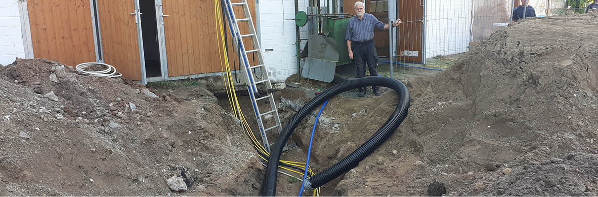 Die Versorgungsleitungen werden teilweise in die Erde gelegt und führen teilweise durch den Stall. Das spart Kosten und es muss nicht die gesamte Hof aufgebaggert werden. (Im Hintergrund unser Vorsitzender des Vereins Richard Weißmann, der sich gerade ein Bild vom Stand der Baustelle verschafft).