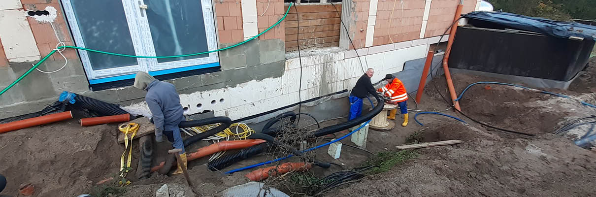 Das Heizleitungspaket, der Schlauch für das Regenwasser zur Toilettenspülung, die Stromleitung und das Glasfaserkabel werden durch Kernbohrungslöcher in den Technikraum geführt. Im Hintergrund ist der Bunker für die Holzhackschnitzel zu erkennen, allerdings noch provisorisch abgedeckt.