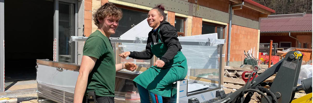 Einen ersten großen Einzug in unseren neuen Hofladen konnten wir auch schon vornehmen: Lukas Hölderle unser ehemaliger Freiwilliger hilft aktuell aus im Außen- und Stallbereich des Hofes. Hier sieht man ihn den Einzug unserer neuen Bedientheke vorzunehmen. Clara unsere FSJ-Kraft aus der Dominikanischen Republik ist hier das Gegengewicht das entscheidend ist, dass die Theke Milimeter für Milimeter in den Laden geschoben werden kann ohne zu kippen und das macht sie mit einer guten Portion Lebensfreude. Übrigens: es war tatsächlich nicht viel Luft bei diesem Transport: es blieben gerade mal 20 mm rechts und links der Tür.