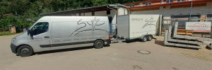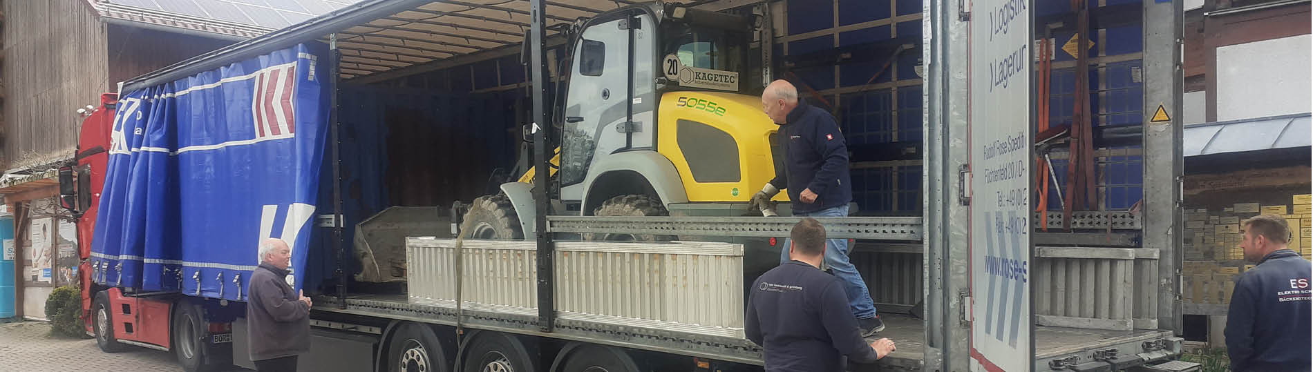 Nach und nach wird es es wieder frei rund um das neue Gebäude. Die Fa Kagetec, die den Estrich und die Bodenfliesen in unserem Neubau verlegt hat – und dies war ein ganz schön großes Arbeitspensum – , verlässt unseren Hof samt der technischen und materiellen Ausrüstung des Unternehmens. Auf dem Foto sieht man den elektrisch angetriebener Radlader des Unternehmens, der soeben auf den LKW verladen wurde.