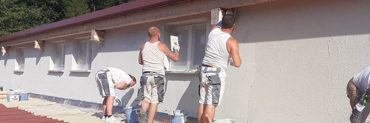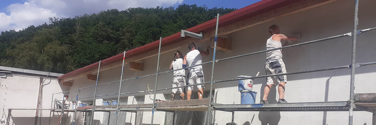 Die Männer der Fa. Nabinger aus dem Nachbardorf Wattenheim bereiten die Außenwände für die Verputzarbeiten vor. Sie setzen die Eckschienen, decken Fenster und Türen ab und ziehen Gewebe dort auf, wo unterschiedliche Baumaterialien aufeinander treffen, um einer Rissbildung entgegenzuwirken. So gut vorbereitet, kann in den nächsten Tagen verputzt werden.