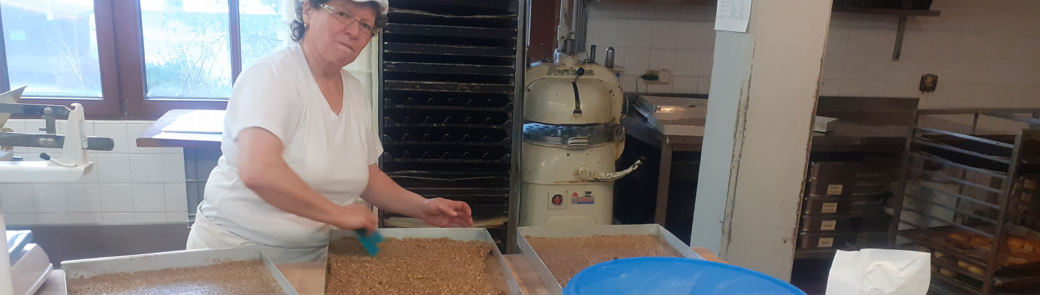 Hier auf dem Foto sieht man unsere Bäckerei-Mitarbeiterin Christine Diehl bei der Zubereitung der letzten Nussecken in unserer alten Backstube am Sonntagnachmittag. So ist der Nachschub während des Umzugs in die neue Bäckerei in den nächsten Tagen gesichert. Dieses letzte Backen war sicherlich für das ganze Team ein Moment, der viele Erinnerungen aufkommen ließ.