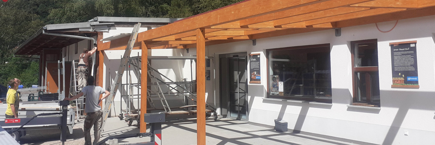 Ende Juni bis Anfang Juli haben wir begonnen das von uns so sehr gewünschte Vordach vor dem neuen Hofladen für unsere Kunden zu realisieren. Dieses war aufgrund der stark angestiegenen Baukosten aus finanziellen Gründen erst einmal eingespart worden. Es hätte unseren Verein finanziell einfach überfordert. Erneut dürfen wir uns bei den Verantwortlichen der Dietmar Hopp Stiftung bedanken, dass dieser Wunsch nun doch in Erfüllung gehen kann. Vom Wetter geschützt laden wir damit parallel zum Einkauf unserer leckeren Produkte zum Verweilen auf dem Hof ein. Hier können unsere Kunden sitzen, sich unterhalten bei einem Getränk oder mit einem Gebäckstückchen aus unserem Hofladen.