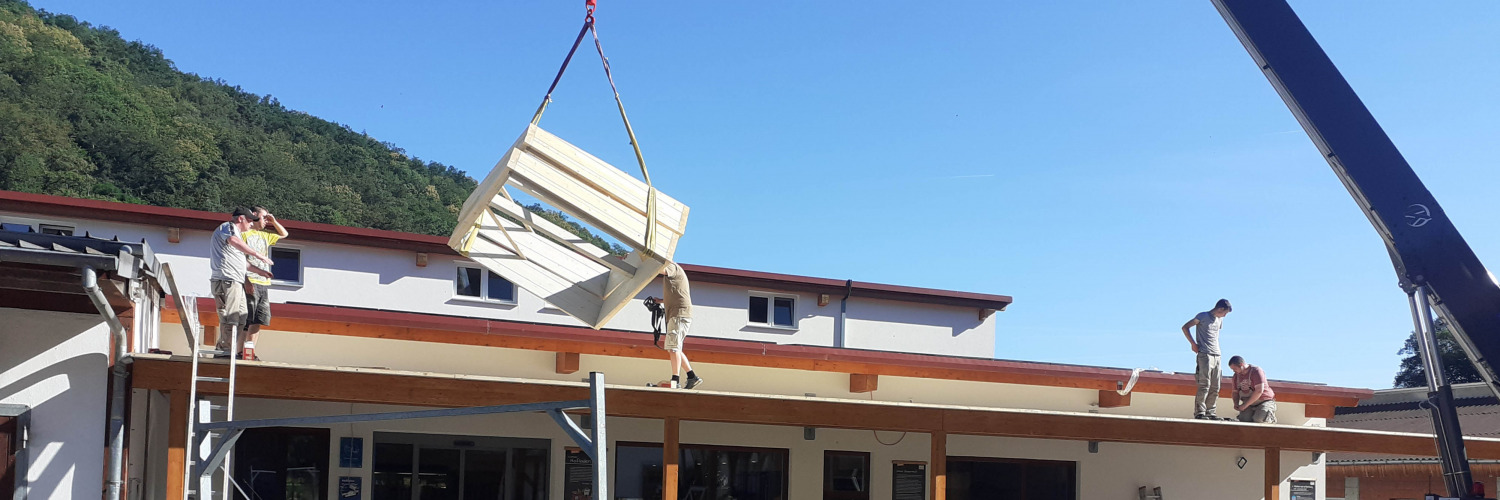 Die tragende Konstruktion für unser Vordach vor dem Hofladen ist fertig. Nun wird mit von unseren Zimmerern vorgefertigten dreifachverleimten Platten beplankt. Auch dabei leistet der gemietete Kran wertvolle Dienste.