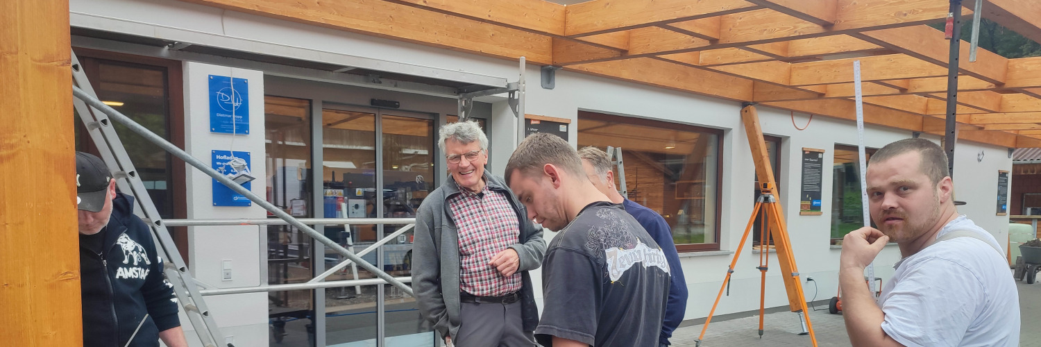 Und was ist das besondere an diesem Vordach? Hier sehen Sie das inklusive Team des Bereichs „Holzbau“ der Dürkheimer Werkstätten. Hier arbeiten fünf Beschäftigte mit Beeinträchtigung unter Anleitung von ihrem Gruppenleiter Jürgen Schäfer (man kann ihn unten im Bild beim Einmessen sehen). Und das Tolle: was die alles Großes und Professionelles leisten!!! Und für unsere Lebenshilfe ist bei vielen Bauten – zum Beispiel auch dem Leprima Biomarkt Erweiterungsbau in Bad Dürkheim – so wertvoll, dass auch immer wieder Eigenleistungen möglich sind.