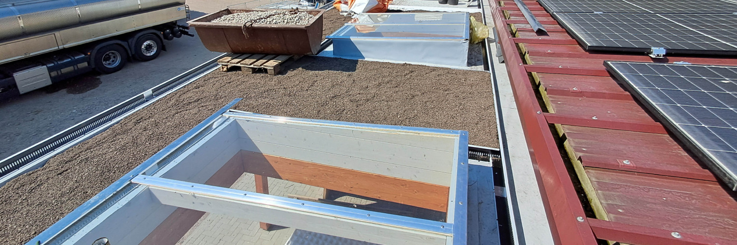 Nachdem unsere Zimmerer der Dürkheimer Werkstätten die Verglasung der vier Lichtkuppeln unseres Vordaches am Hofladen montiert haben, bringen nun die Männer der Dachdeckerei Peter Petry das Substrat zur Dachbegrünung auf. Ein Flies – darunter aufgebracht – schützt die Dachhaut vor Beschädigung durch die Steine.