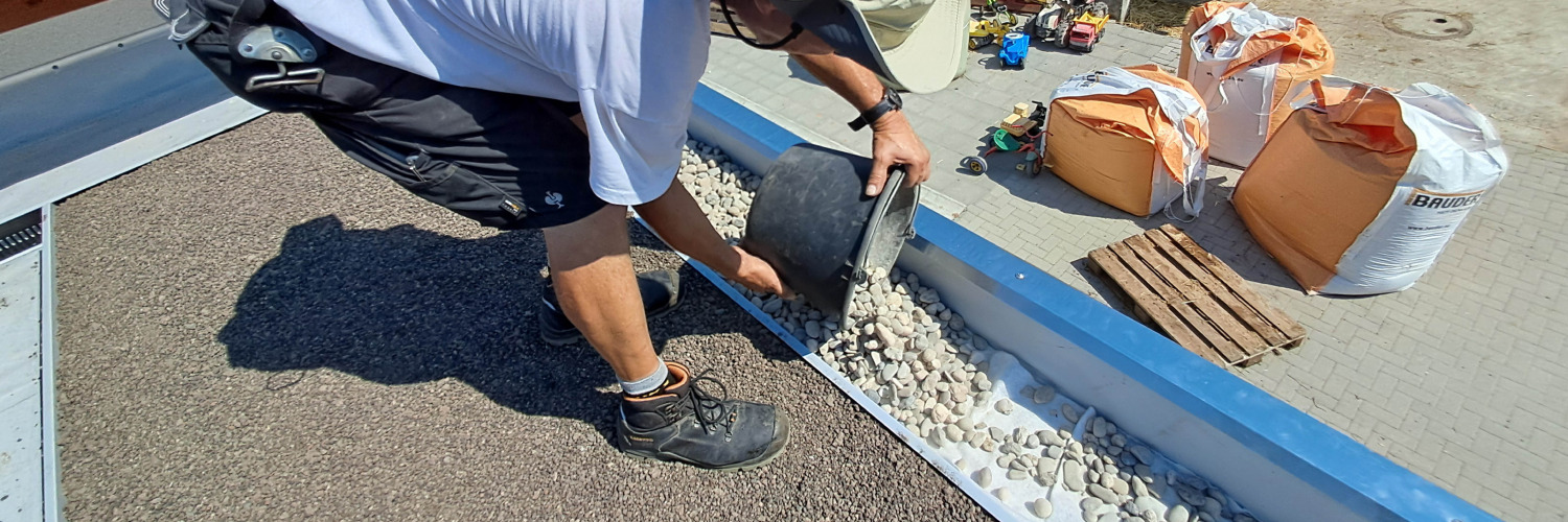 Um eine kontrollierte und gefilterte Entwässerung der begrünten Dachfläche zu erreichen, wird in den Randbereichen eine Schüttung aus Kies eingebracht.