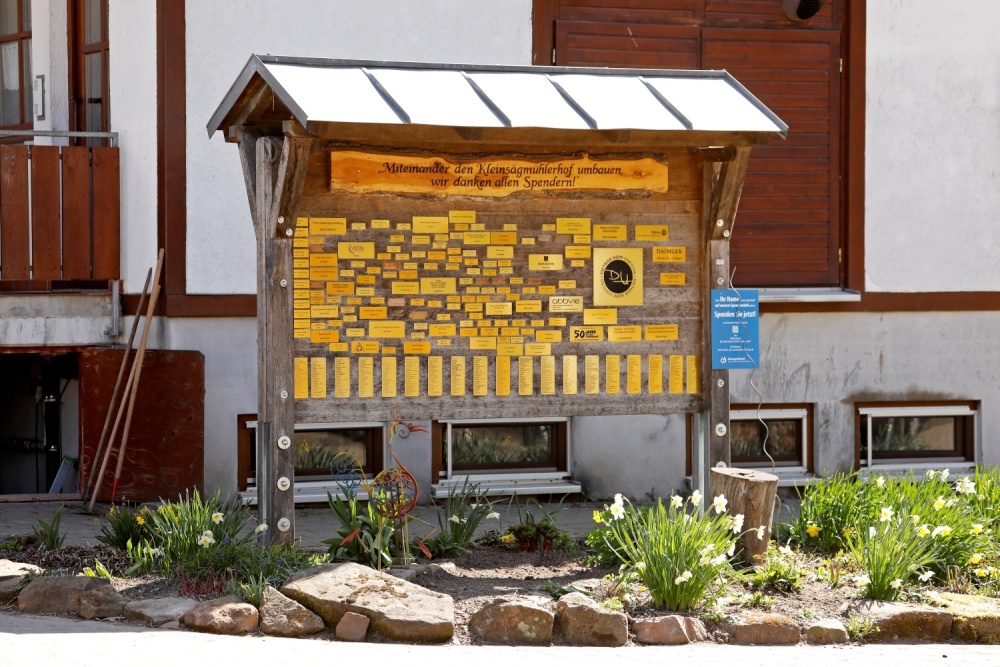 Besondere Spender, die in ihren kumulierten Einzelspenden eine Grenze von 1.000 Euro überschritten haben, finden auf Wunsch an einer eigens dafür vorbereiteten Spendenwand auf dem Kleinsägmühlerhof ihre persönliche Spendentafel. Natürlich steht es Ihnen auch frei, die Tafel abzulehnen. Sprechen Sie uns gerne an, wenn Sie eine eigene Spendentafel für Ihre Spende möchten.