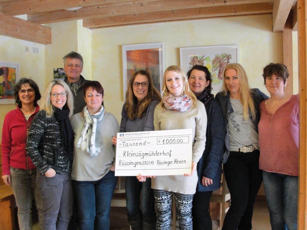 Rüssingen. Über eine Spende in Höhe von stolzen 1.000 € durfte sich das Team des Kleinsägmühlerhof der Lebenshilfe Bad Dürkheim e.V. freuen. Die Rüssinger Hexen sammelten an Altweiberfastnacht sehr erfolgreich Straßenzoll für den guten Zweck. Die gesammelte Straßenmaut überbrachten sie dem Ehepaar Maria und Richard Danner bei einem gemeinsamen Treffen auf dem Hof. Das gesammelte Geld soll in die laufenden Baumaßnahmen auf dem Hof fließen und soll helfen, die zukunftsweisende Ausrichtung des Hofes möglich zu machen. Schon bald soll mit den Planungen für die Weiterverarbeitung (Hofladen, Molkerei und Bäckerei) begonnen werden. „Wir sind überwältigt von so einem besonderen Engagement und sagen ganz herzlich Danke“, betonte Richard Danner bei dem gemeinsamen Termin vor Ort.